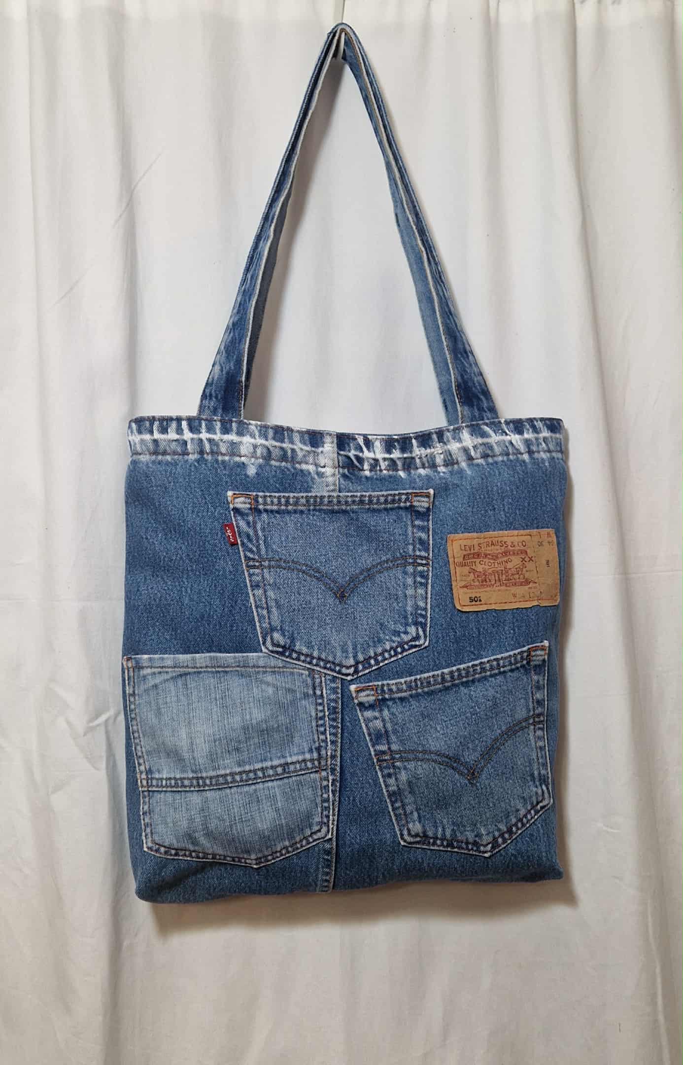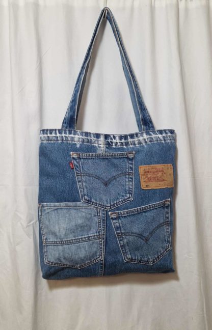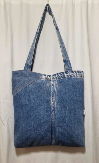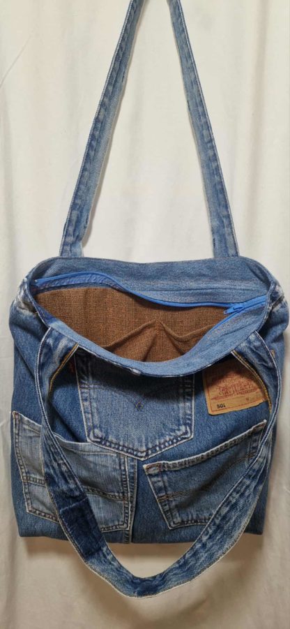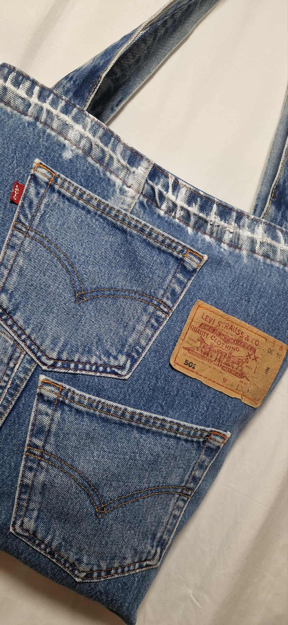 Torba jeansowa z jeansowymi rączkami. W środku posiada podszewkę z kieszonkami, zewnętrzne kieszenie również są użytkowe. Torba zapinana jest na zamek, tył jest gładki .Aby uzyskać lepszy efekt przetarć torba jest lekko pomalowana białą farbą. Do uszycia wykorzystano spodnie jeansowe oraz nową podszewkę. Przed szyciem jeans jest prany i prasowany. Wymiary ; szerokość u góry mierzona na płasko 41cm, wysokość 39cm, głębokość 7 cm, rączki 77 cm. Niepowtarzalność gwarantowana.