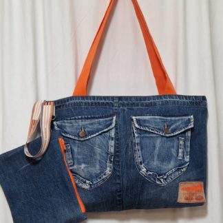 Torba jeansowa z jeansowymi rączkami i bardzo efektownymi przetarciami typowymi dla spodni jeansowych( dodatkowo kolor przetarć podkręcony jest białą farbą) W środku posiada podszewkę z kieszonkami, zewnętrzne kieszenie również są użytkowe. Torba zapinana jest na zamek, tył jest gładki. Jeans pochodzi z recyklingu, pozostałe elementy są nowe. Przed szyciem jeans jest prany i prasowany. Wymiary ; szerokość u góry mierzona na płasko 48 cm, wysokość 38,5 cm, głębokość 8 cm, rączki 77 cm. Niepowtarzalność gwarantowana.