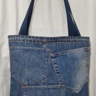 Torba jeansowa z jeansowo -parcianymi rączkami oraz ozdobnymi koronkowymi serwetkami. W środku posiada podszewkę z kieszonkami, zewnętrzne kieszenie również są użytkowe. Torba zapinana jest na zamek. Jeans pochodzi z recyklingu, serwetki również z drugiego obiegu, pozostałe elementy są nowe. Przed szyciem jeans jest prany i prasowany. Wymiary ; szerokość u góry mierzona na płasko 48cm, wysokość 38 cm, głębokość 8 cm, rączki 71 cm. Niepowtarzalność gwarantowana.