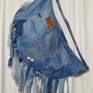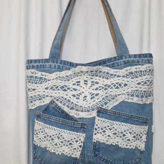 Torba jeansowa z jeansowo -parcianymi rączkami oraz ozdobnymi koronkowymi serwetkami. W środku posiada podszewkę z kieszonkami, zewnętrzne kieszenie również są użytkowe. Torba zapinana jest na zamek. Jeans pochodzi z recyklingu, serwetki również z drugiego obiegu, pozostałe elementy są nowe. Przed szyciem jeans jest prany i prasowany. Wymiary ; szerokość u góry mierzona na płasko 48cm, wysokość 38 cm, głębokość 8 cm, rączki 71 cm. Niepowtarzalność gwarantowana.