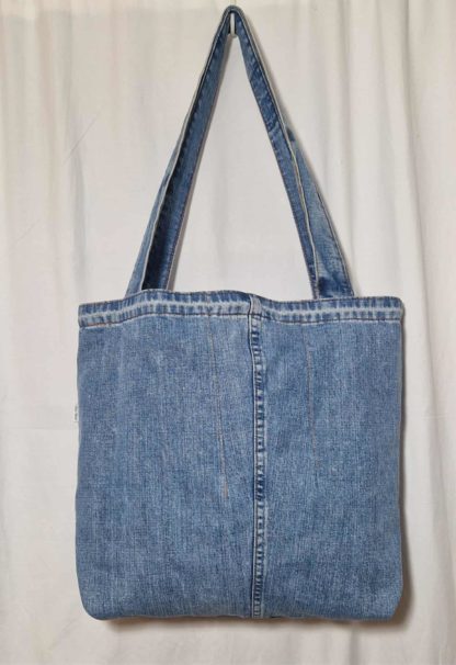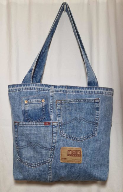 Torba dżinsowa z dżinsowymi rączkami . Kolor typu wycieruch. W środku posiada podszewkę z kieszonkami, zewnętrzne kieszenie również są użytkowe. Torba zapinana jest na zamek, tył jest gładki .Jeans pochodzi z recyklingu, pozostałe elementy są nowe. Przed szyciem jeans jest prany i prasowany. Wymiary ; szerokość u góry mierzona na płasko 46cm, wysokość 35,5 cm, głębokość 7 cm, rączki 76cm. Niepowtarzalność gwarantowana.