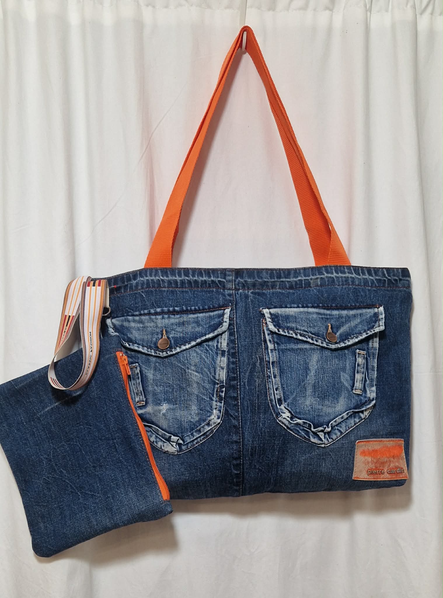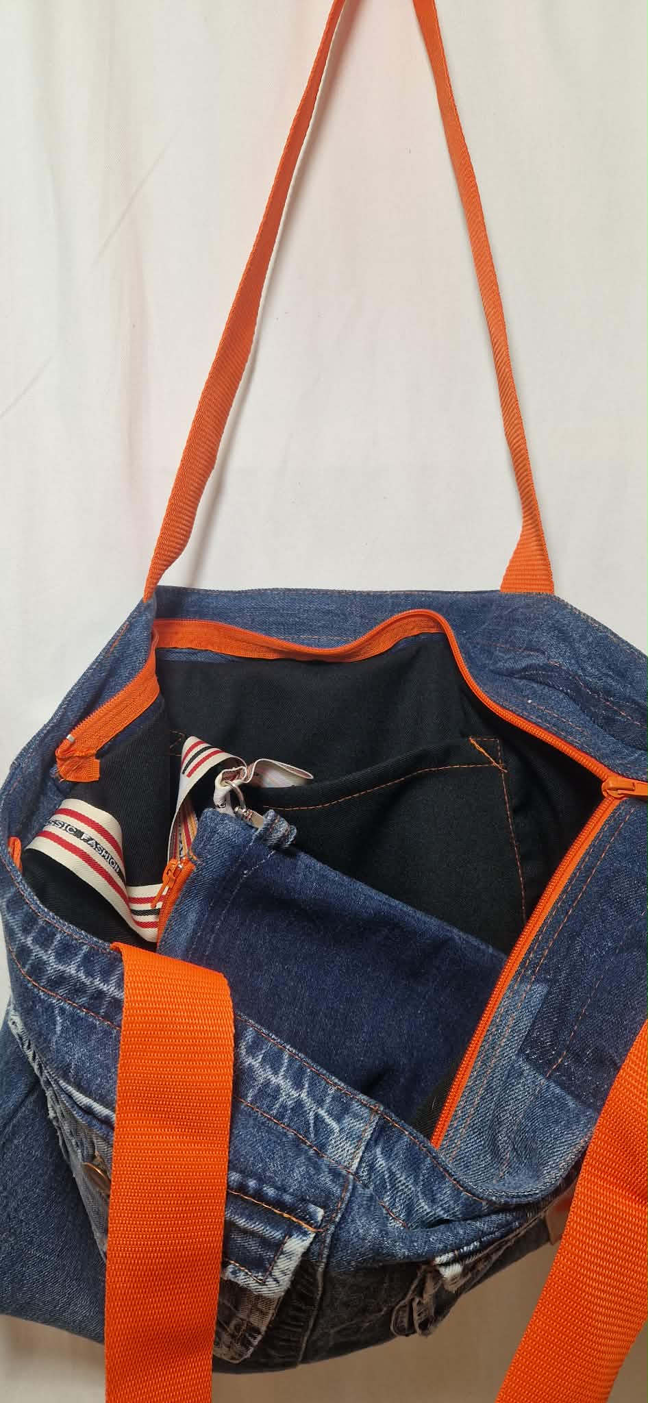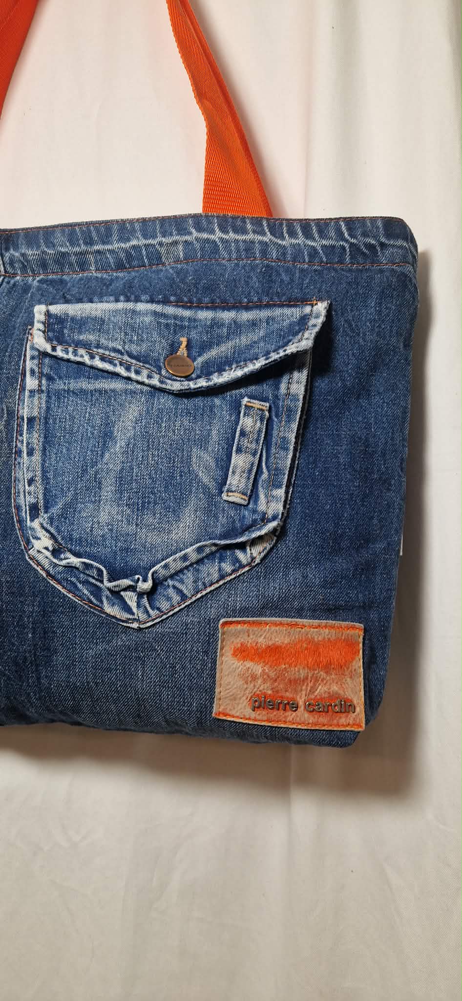 Torba jeansowa z parcianymi, sztywnymi rączkami w kolorze pomarańczowym. W środku posiada podszewkę z kieszonkami, zewnętrzne kieszenie również są użytkowe. Do torby jest dołączona kosmetyczka na odpinanej smyczy. Tył torby jest gładki, kształt prostokątny, zapięcie na zamek. Jeans pochodzi z recyklingu, pozostałe elementy są nowe. Przed szyciem jeans jest prany i prasowany. Wymiary ; szerokość u góry mierzona na płasko 52 cm, wysokość 32 cm, głębokość 8 cm, rączki 74cm. Kosmetyczka 26 x21 cm. Niepowtarzalność gwarantowana.