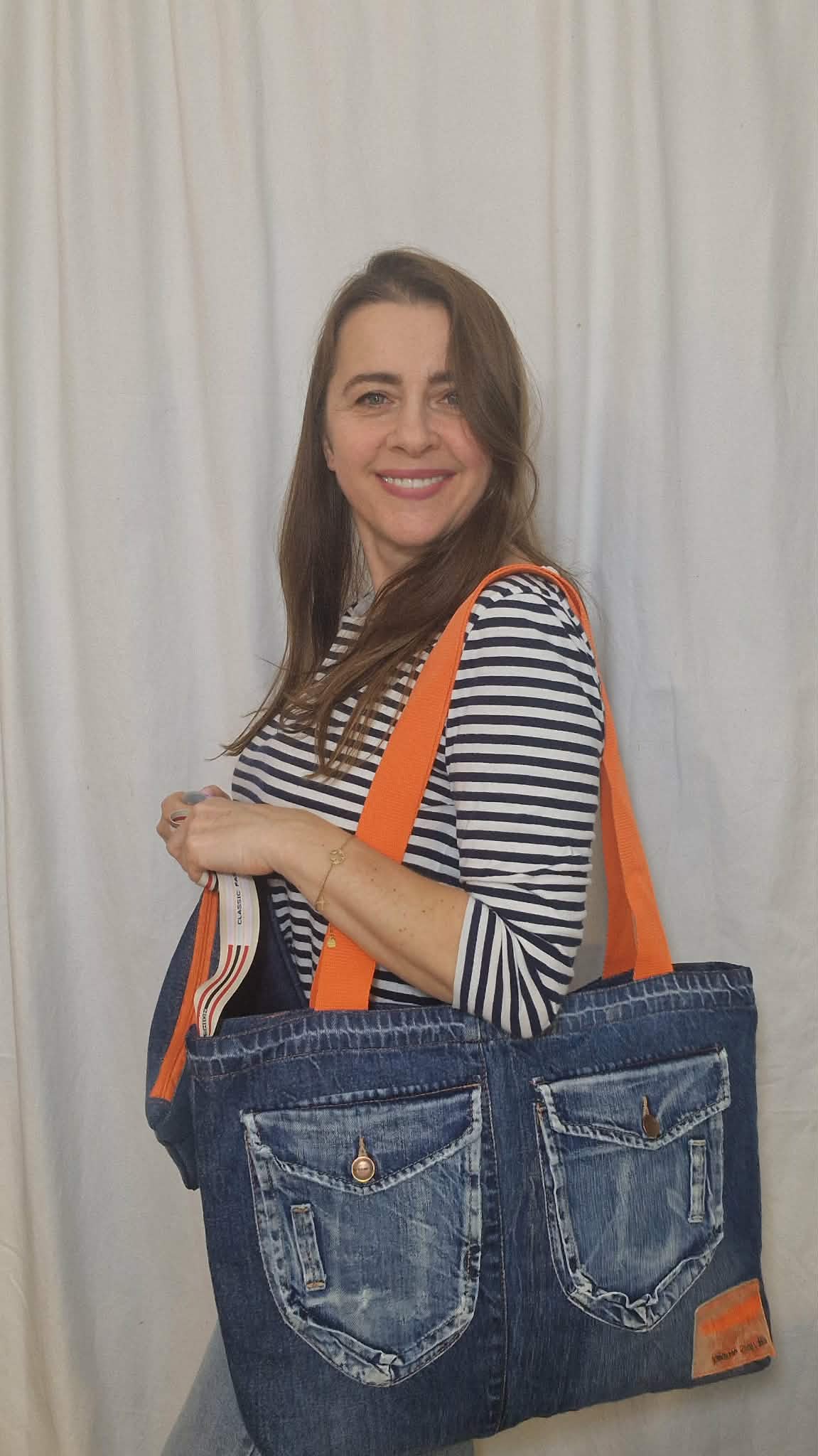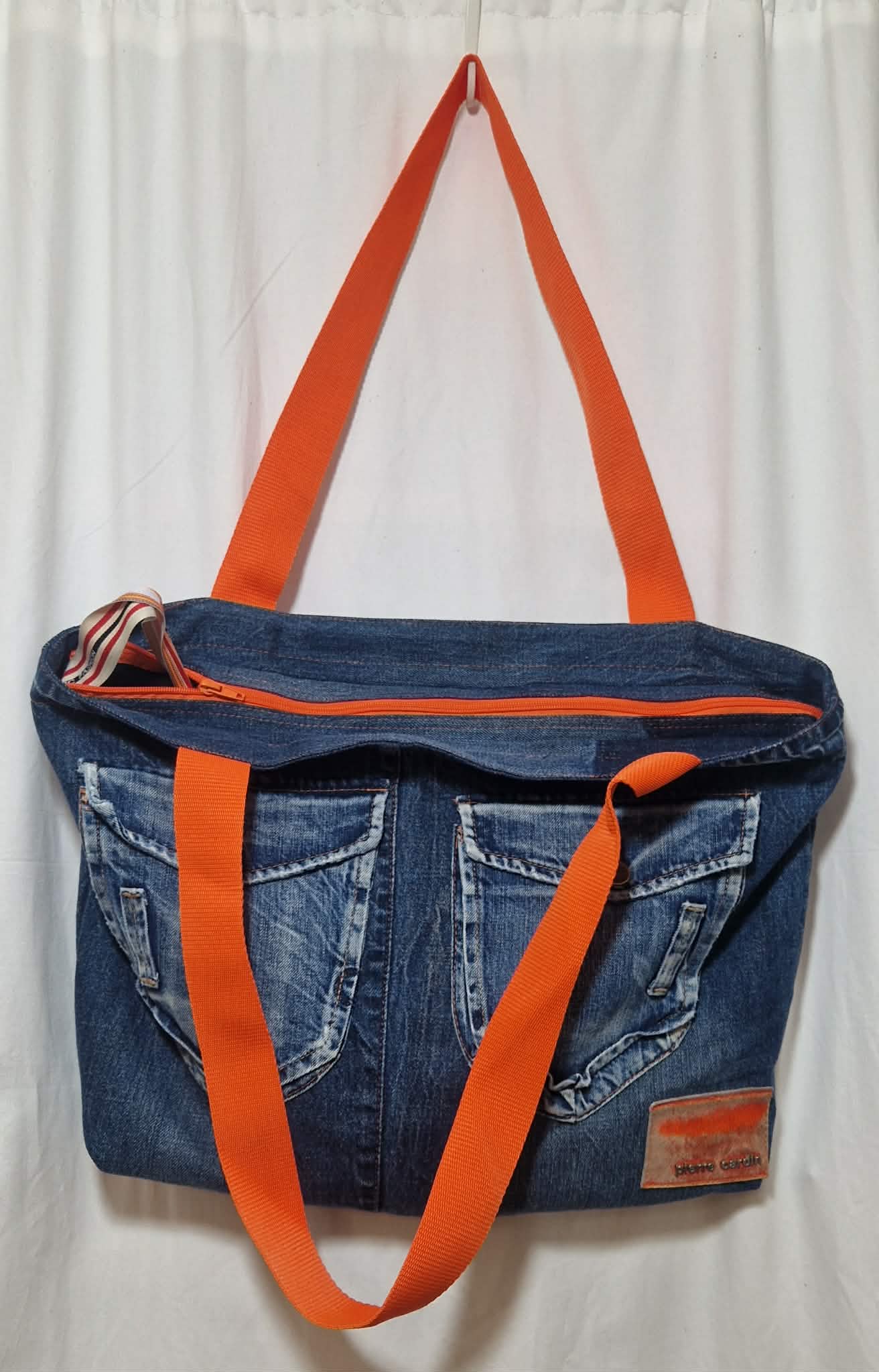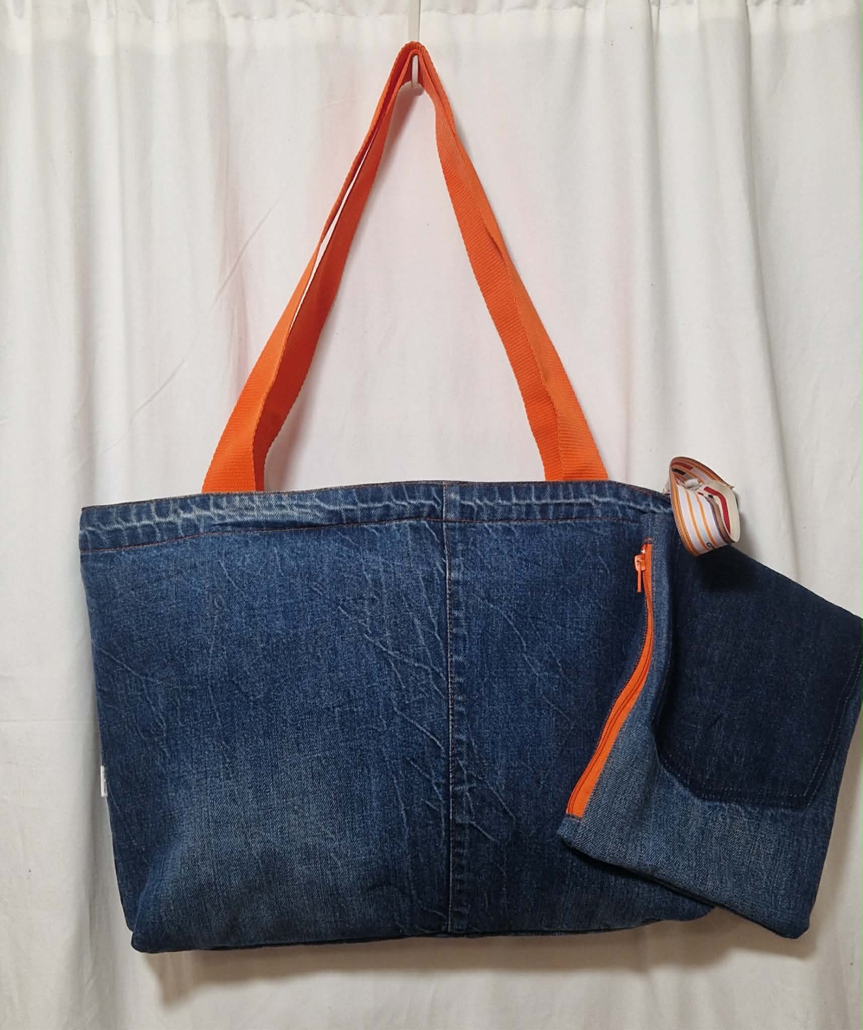 Torba jeansowa z parcianymi, sztywnymi rączkami w kolorze pomarańczowym. W środku posiada podszewkę z kieszonkami, zewnętrzne kieszenie również są użytkowe. Do torby jest dołączona kosmetyczka na odpinanej smyczy. Tył torby jest gładki, kształt prostokątny, zapięcie na zamek. Jeans pochodzi z recyklingu, pozostałe elementy są nowe. Przed szyciem jeans jest prany i prasowany. Wymiary ; szerokość u góry mierzona na płasko 52 cm, wysokość 32 cm, głębokość 8 cm, rączki 74cm. Kosmetyczka 26 x21 cm. Niepowtarzalność gwarantowana.