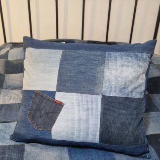 Poszewka jeansowa zapinana z tyłu na zamek, materiał pochodzi z recyklingu, przed szyciem jest prany i prasowany. Na przodzie ozdobiona kieszenią. Wymiary 38X50 cm. Zaleca się wkład w większym rzmiarze np 40×60. Najlepiej prezentuje się w grupie innych poduszek.